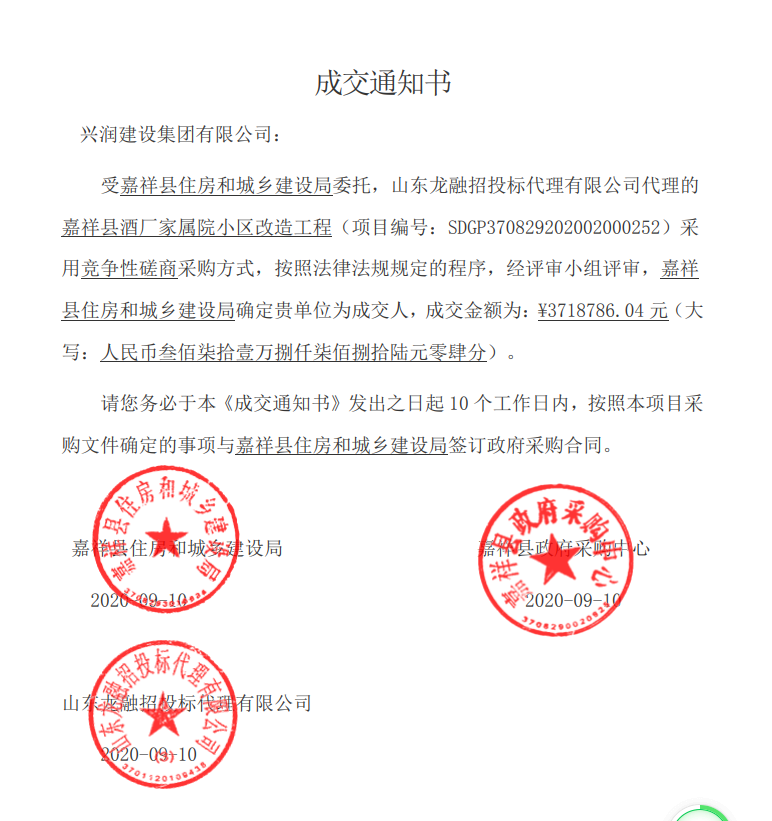 【招投标信息】2020年度嘉祥县老旧小区改造工程建设项目(酒厂家属院校区改造工程)成交通知书