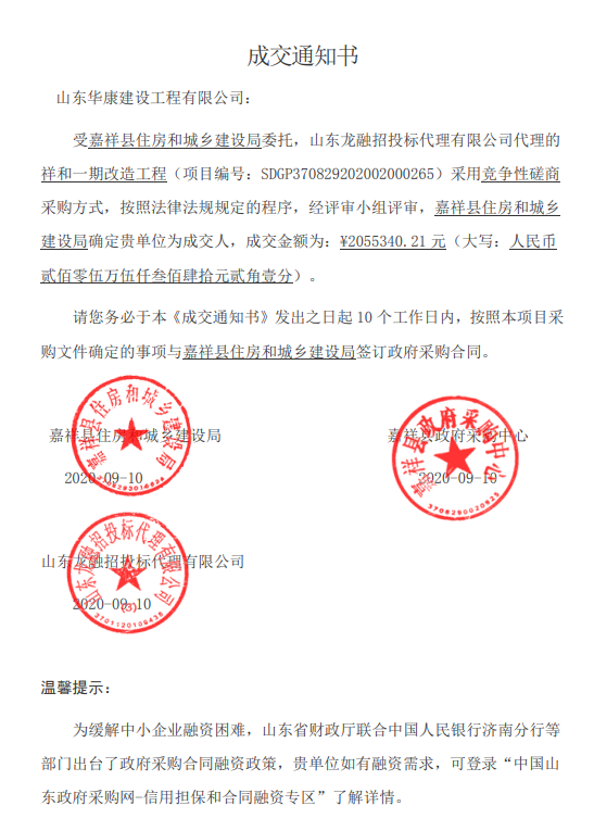 【招投标信息】2020年度嘉祥县老旧小区改造工程建设项目(祥和一期改造工程)成交通知书