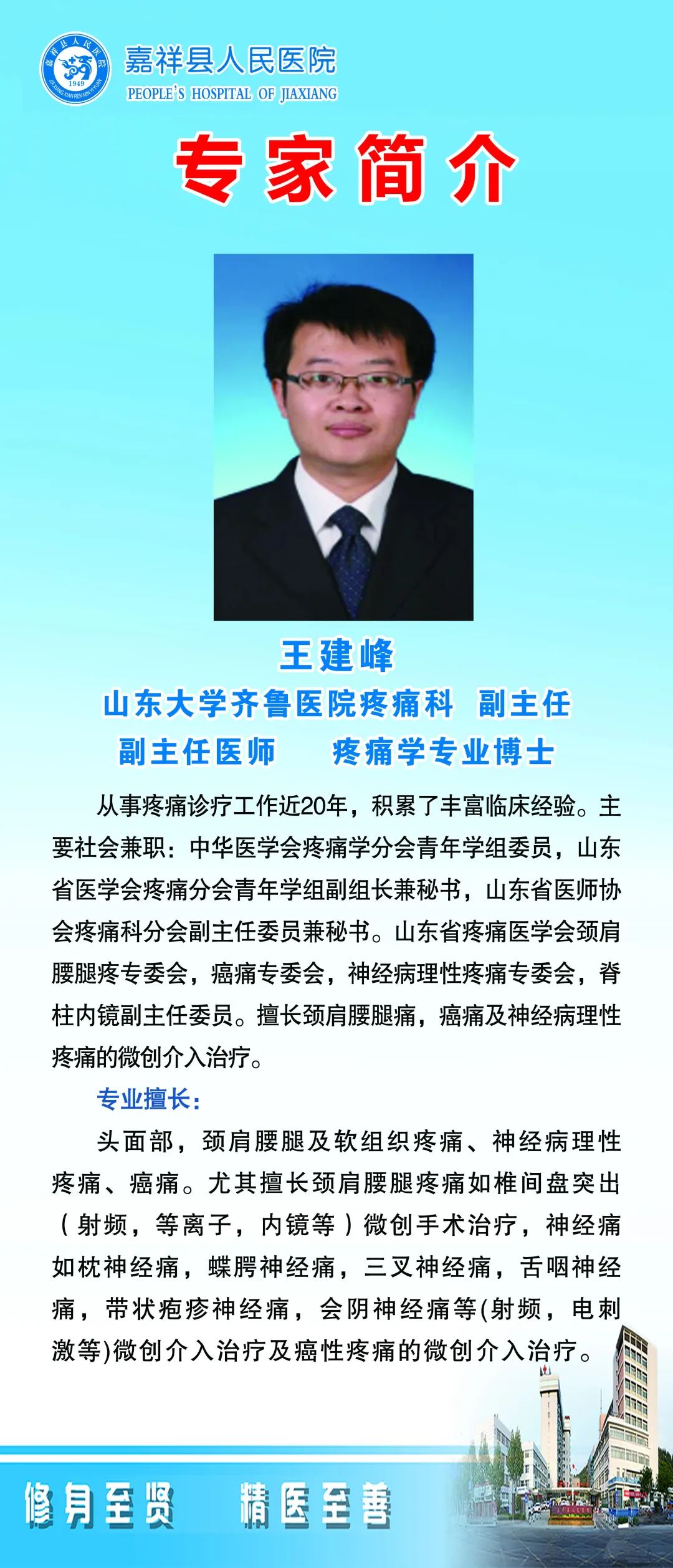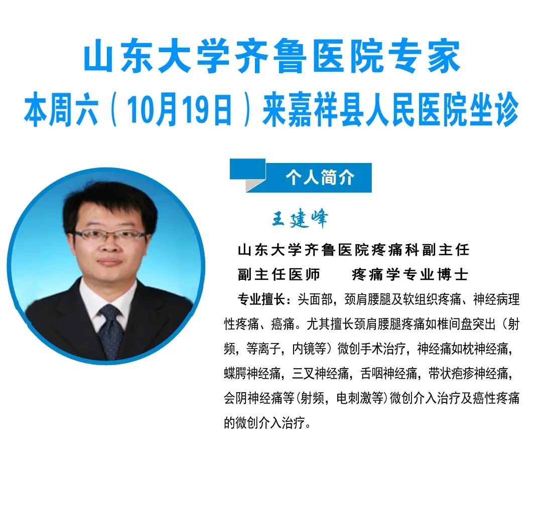 专家简介坐诊时间:10月19日(周六8:30开诊)坐诊科室:疼痛科门诊(门诊三楼疼痛科)预约挂号:请挂疼痛科孙龙飞专家号预约电话:0537--6811120(编辑:刘蕾 审核:韩方)