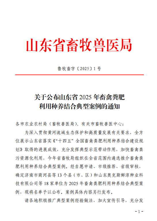 10月27日,山东省畜牧兽医局公布山东省2025年畜禽粪肥利用种养结合典型案例遴选结果,经过严格遴选,我县“山东璟元农牧发展有限公司畜禽粪污资源化利用案例”从全省众多优秀案例中脱颖而出,成功入选,是济宁市唯一入选企业。