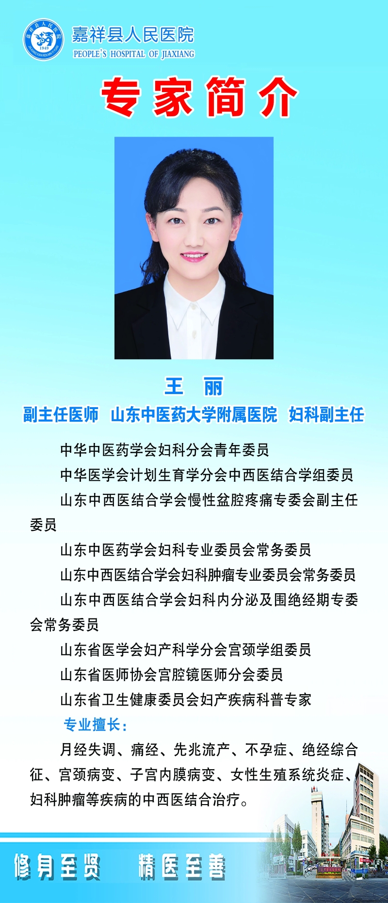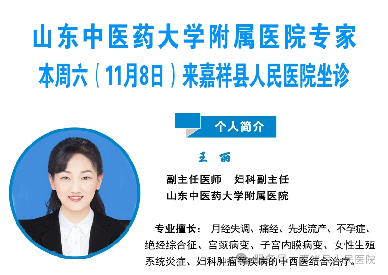专家简介坐诊时间:11月8日(周六8:30开诊)坐诊科室:中医妇科诊室(门诊三楼中医科诊区)预约挂号:请挂中医妇科杨琰娟专家号预约电话:0537--6811120