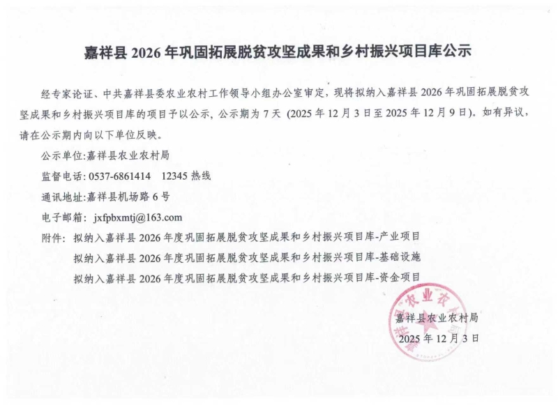 嘉祥县2026年巩固拓展脱贫攻坚成果和乡村振兴项目库公示