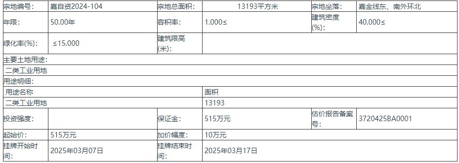 嘉祥县土地储备事务中心国有土地使用权挂牌出让公告(嘉自资规告字[2025]2号)