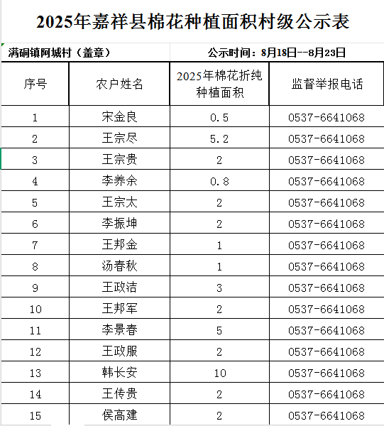 2025年嘉祥县满硐镇棉花种植面积村级公示表