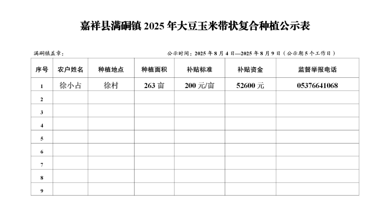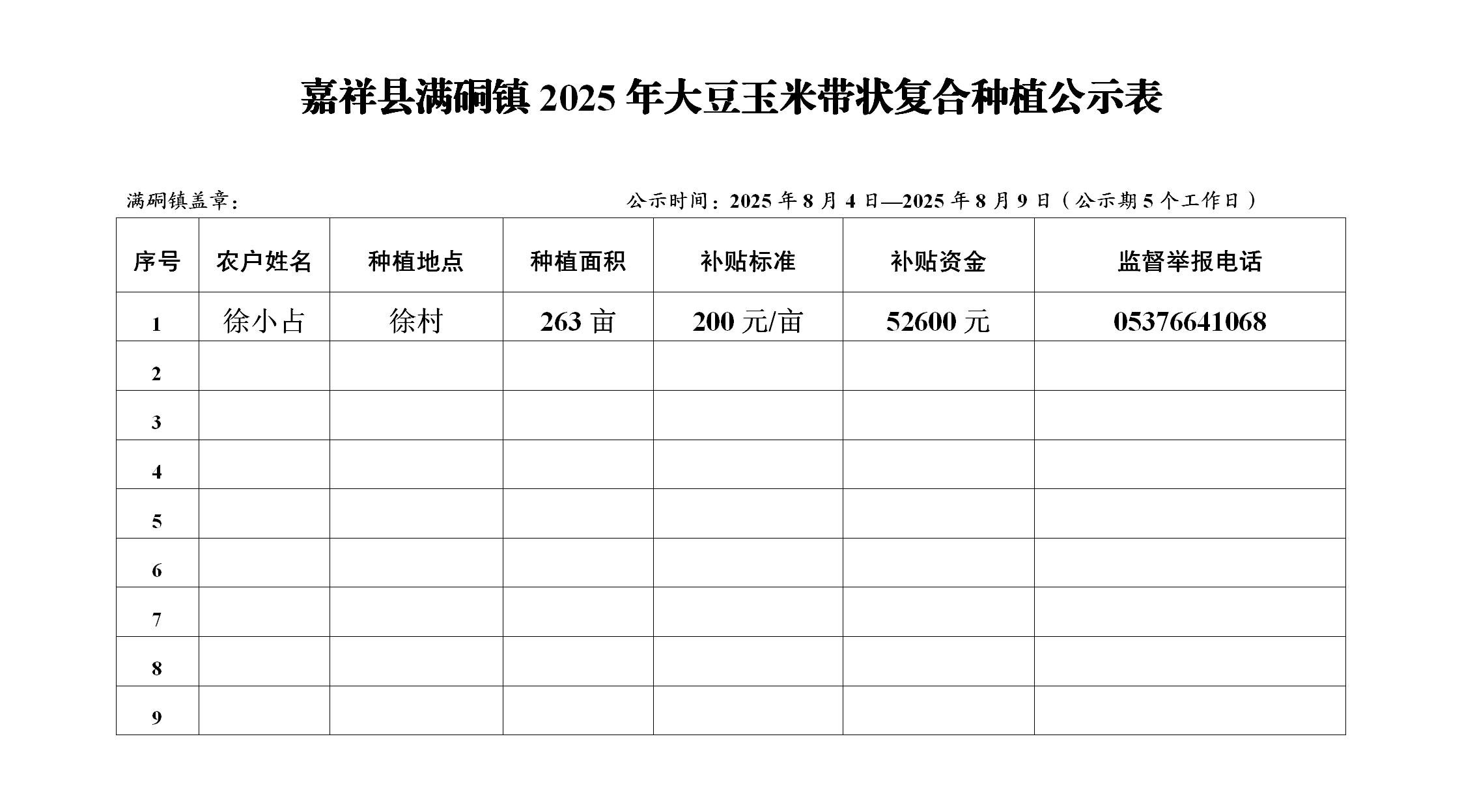 嘉祥县满硐镇2025年大豆玉米带状复合种植公示表
