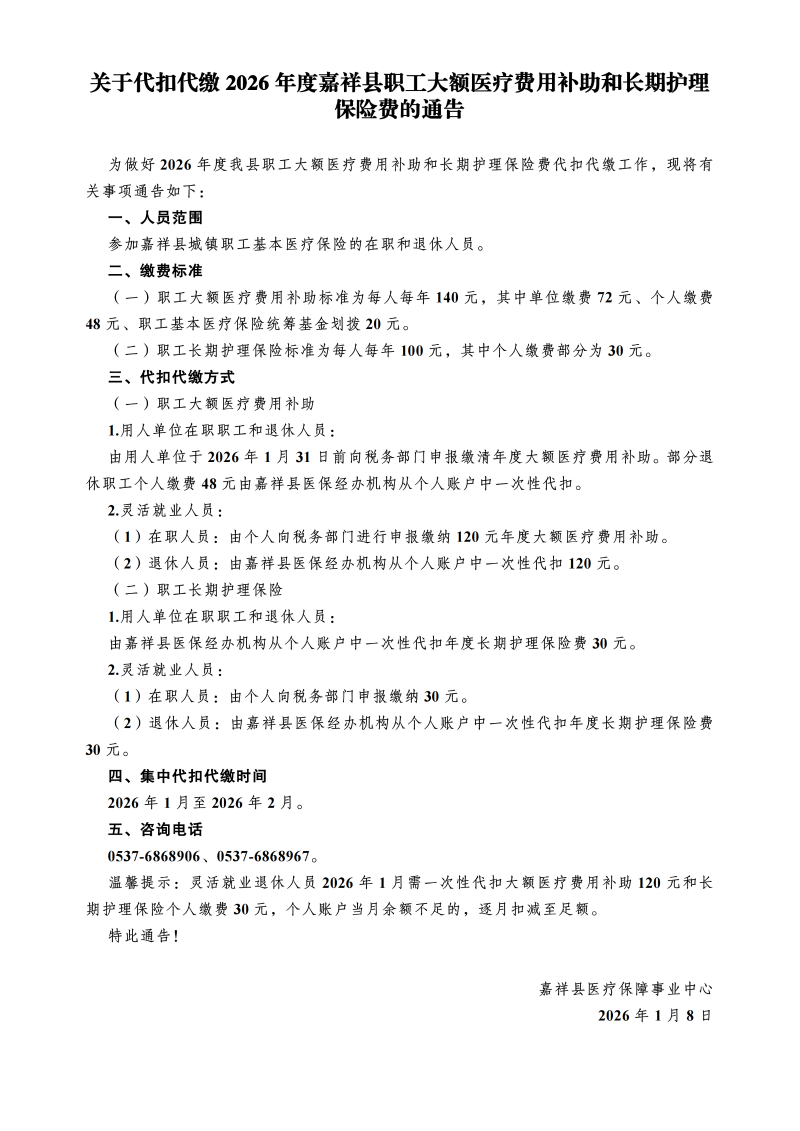 关于代扣代缴 2026 年度嘉祥县职工大额医疗费用补助和长期护理保险费的通告