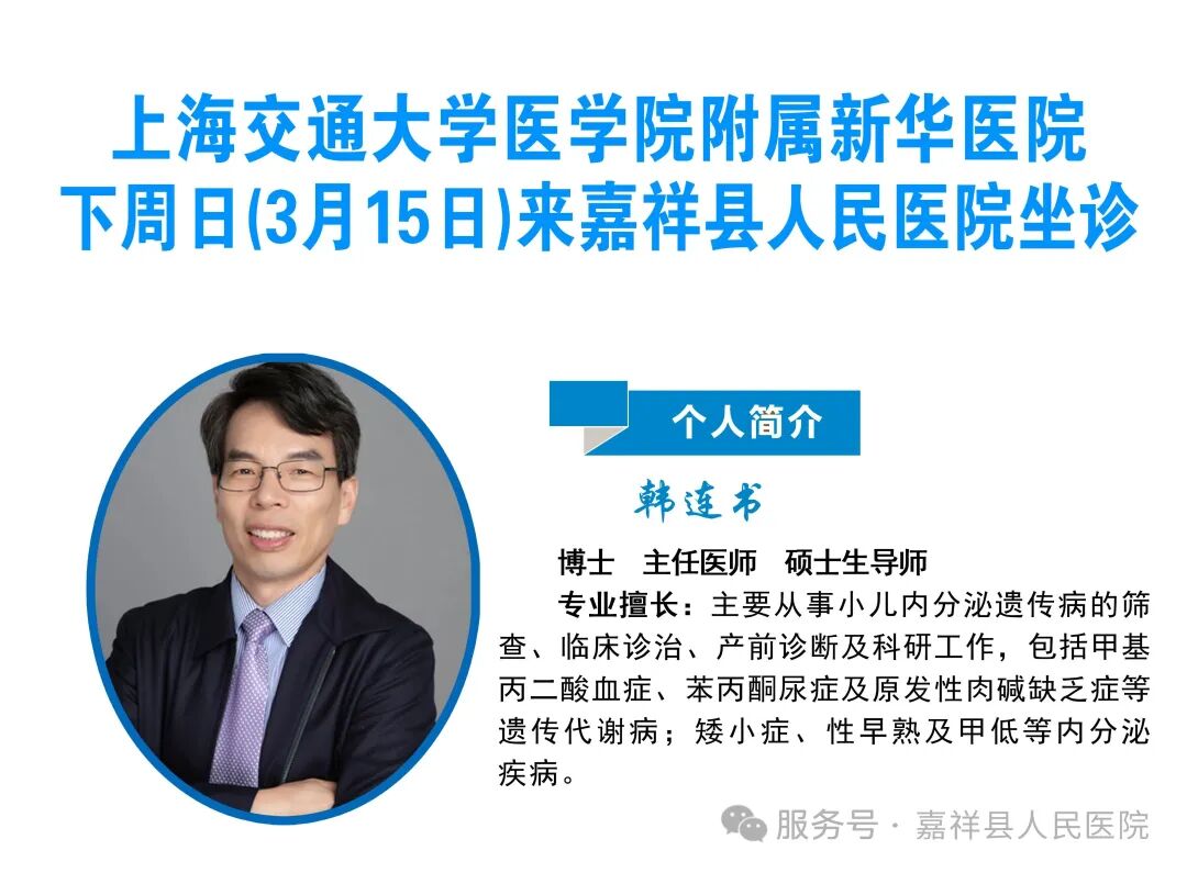 【宝爸宝妈不用怕,我们把国家级教授请到“嘉”】上海交通大学医学院附属新华医院韩连书教授3月15日(星期日)来我院坐诊